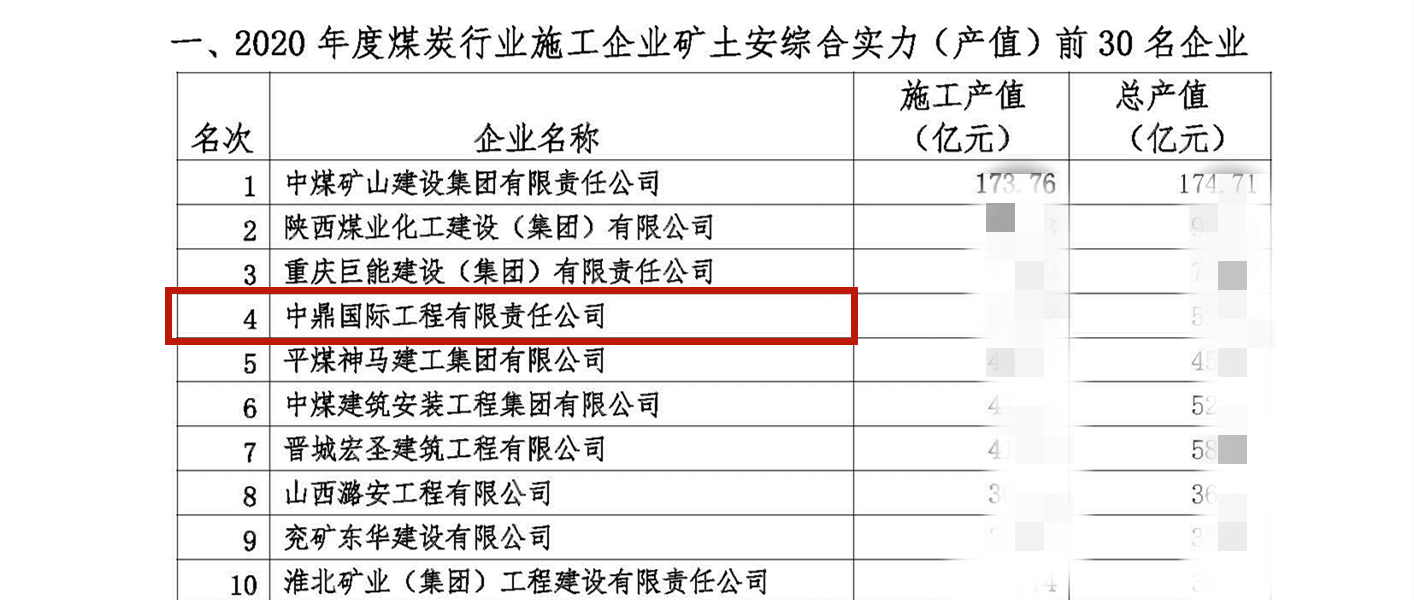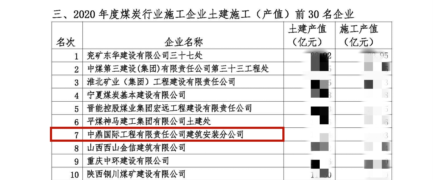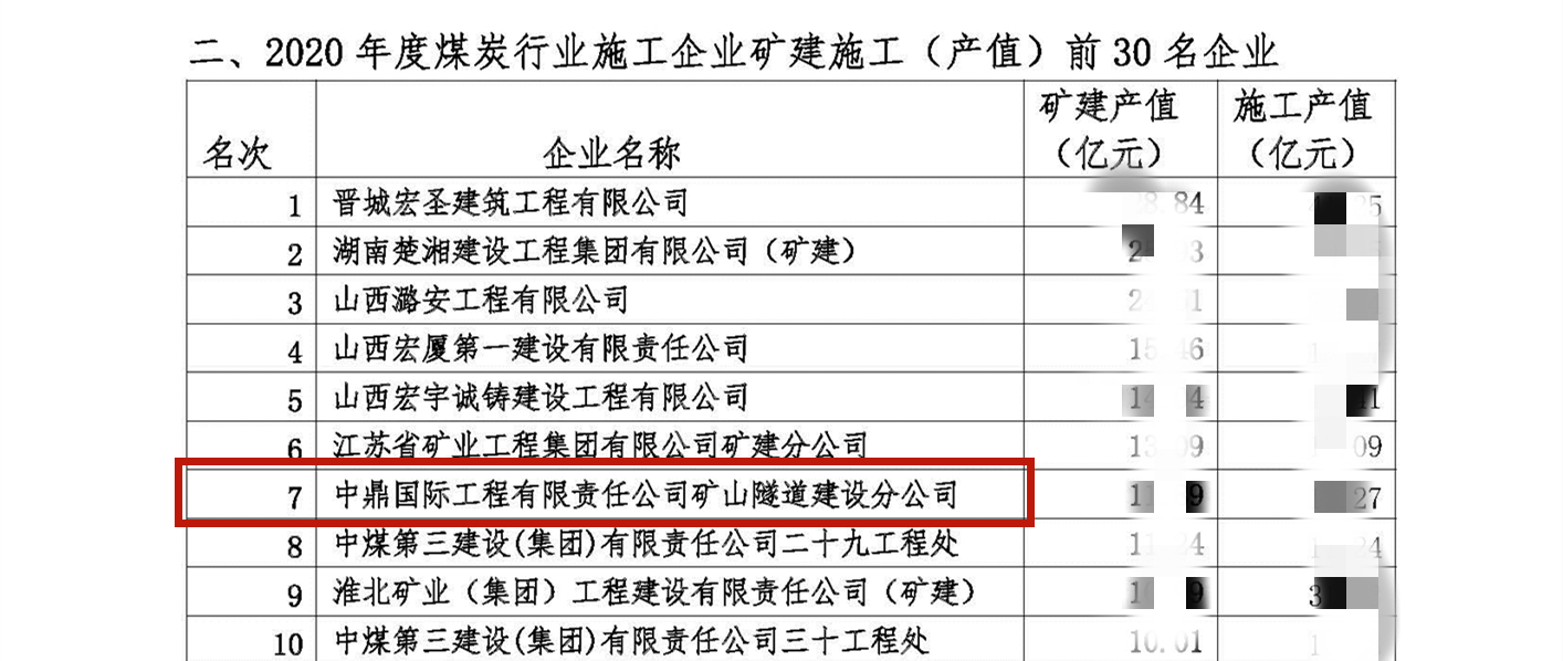 近日,中國煤炭建設(shè)協(xié)會公布了2020年度煤炭行業(yè)施工企業(yè)綜合實(shí)力等多項(xiàng)排名榜單,中鼎國際連續(xù)第11年榮膺年度“煤炭建設(shè)集團(tuán)公司綜合實(shí)力前10名企業(yè)”,2020年位列第4。礦建分公司列入“礦建施工前30名企業(yè)”排名第7,建安分公司列入“土建施工前30名企業(yè)”排名第7。